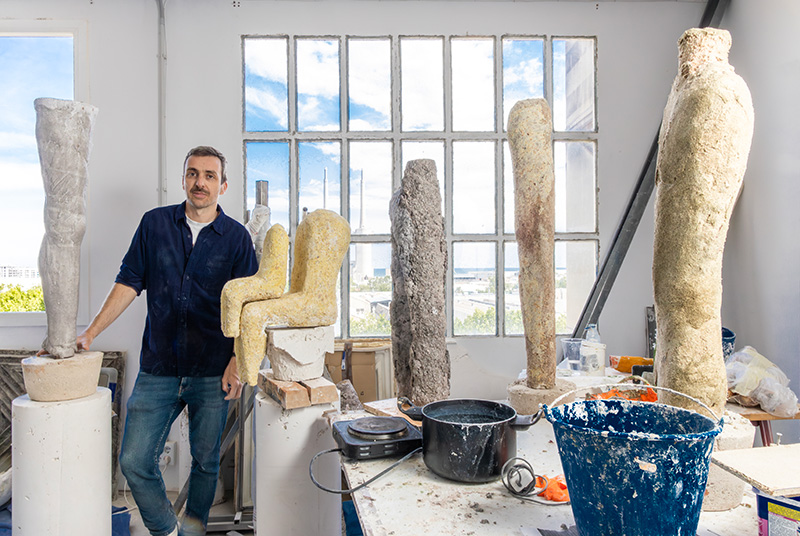 Su estudio es como una habitación con vistas en la sexta planta de un edificio industrial de Badalona, donde cada vez más artistas eligen instalar su lugar de trabajo. Desde los grandes ventanales de David Bestué (Barcelona, 1980) la mirada queda alineada con el edificio de Las Tres Chimeneas, más icónico que nunca después de haber sido sede de Manifesta 15 Barcelona. Y al fondo, el mar; un lujo para los sentidos. Luminoso y aireado, su terraza es ideal para trabajar con los moldes de sus esculturas; el taller está repleto de yesos, de moldes y de pétalos de flores de distintos colores, que utiliza como base de sus pigmentos. Participó en la Bienal de Venecia con Marc Vives en 2009 y desde entonces se fueron sucediendo importantes exposiciones institucionales. Sus esculturas tratan de la estética del fragmento como reflejo de nuestra época, donde todo se superpone y el tiempo se desvanece. En paralelo a su trabajo escultórico, ha escrito libros sobre arquitectura y es comisario de exposiciones, la más reciente, Flor Hispania, en el CA2M.