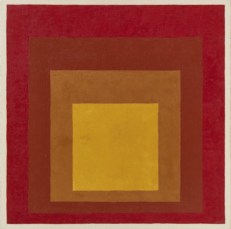 Josef Albers (1888-1976), teórico del color y profesor de la Bauhaus, está representado con Estudio para Homenaje al cuadrado, su proyecto más representativo, una obra valorada entre 300.000 a 400.000 euros. Las obras de esta serie fueron creadas por Albers a partir de 1950 durante su estancia como director del departamento de diseño en la Universidad de Yale. Sobre el modo de ejecutar estas piezas partiendo del cuadrado central señalaba lo siguiente: «[…] mi padre, un artesano honrado y competente, pintor y fontanero, electricista y carpintero, decía que cuando se pinta una puerta hay que empezar por el centro e ir avanzando, porque de esa manera se controla el goteo y no se ensucia uno los puños. Así es como pinto yo los homenajes.»